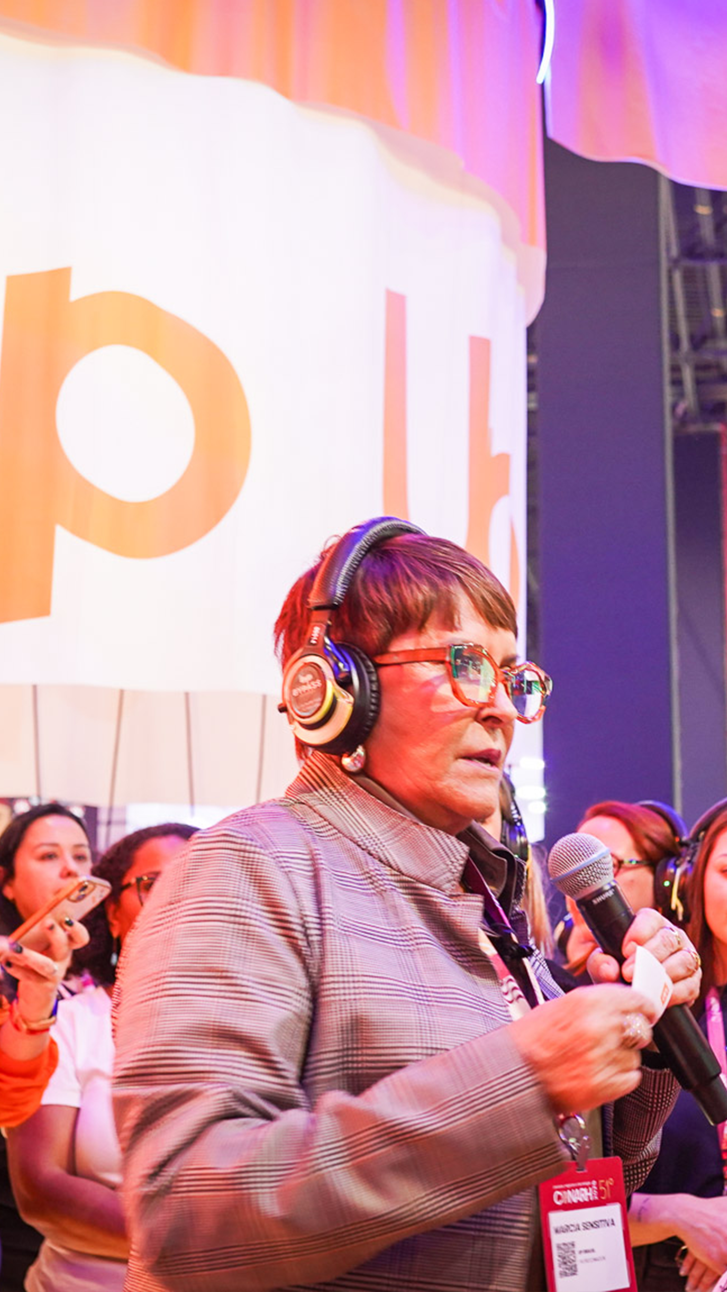 No centro da experiência, foi criada uma arquibancada em formato de “U”, referência direta ao nome Up Brasil, que funcionou como espaço multiuso para conteúdos, conversas e ativações. Inspirado no cenário do Up Talks, esse ambiente recebeu palestras silenciosas com fones de ouvido, permitindo imersão sem interferir no clima sensorial do estande. A programação contou com convidados especiais e profissionais que já fazem parte do ecossistema da marca, reforçando autoridade e conexão genuína com o público de RH.
